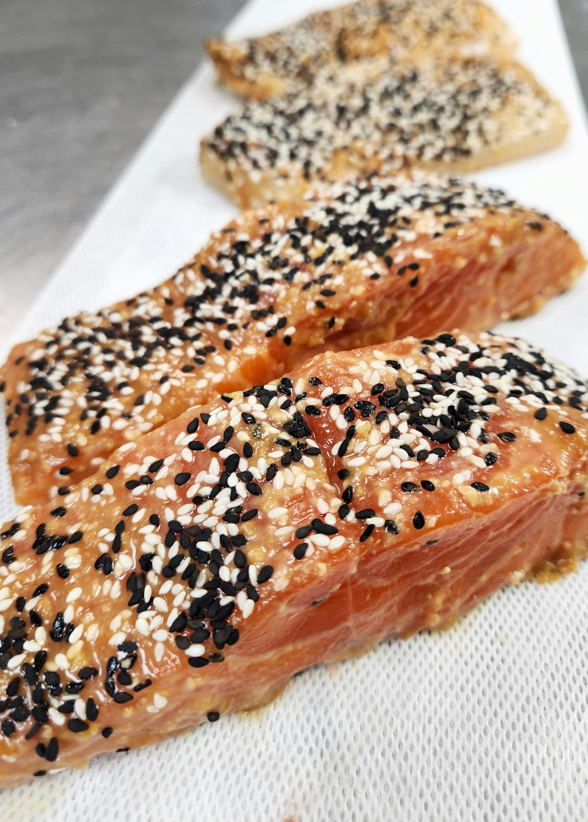 Sustainably caught and delivered fresh, our cod fillets are a seafood lover's dream. Known for its mild flavor and flaky texture, cod is not only delicious but also packed with vitamins and omega-3 fatty acids, supporting heart and brain health. We have fresh daily in-house made miso glazed cod! Place them under a broiler for 3-4 minutes, or until slightly charred and glaze has caramelized. Lower oven to 375 degrees F. Cook an additional 5 to 6 minutes, until fish is flaky but not overcooked. Its a delicious easy mouth watering meal while knowing that everything you're consuming is sustainably caught!